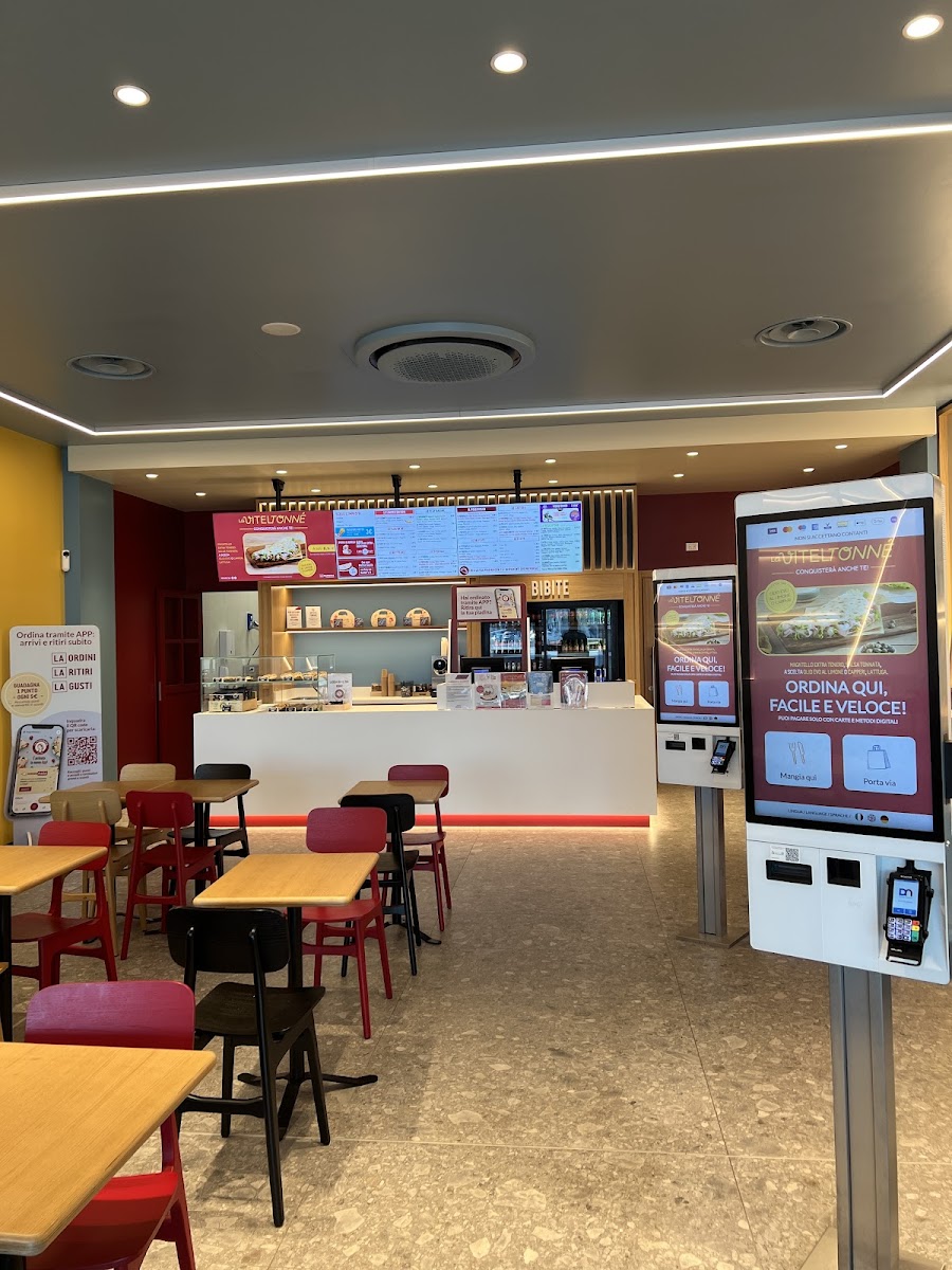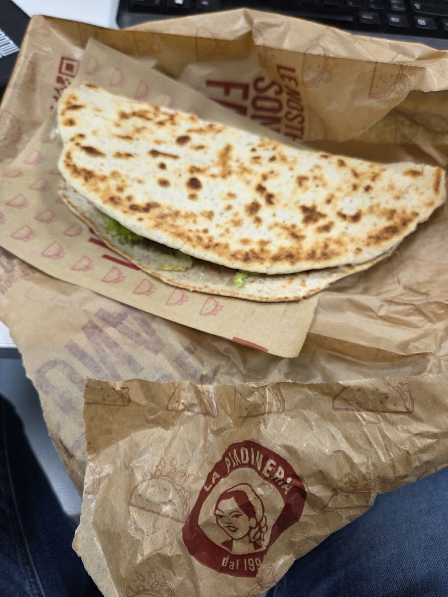 Ristorante buona come tutti della catena Scelta di piadine esaustiva e ampia Possibilità di ordinare tramite i totem scegliendo una tra le piadine pre-esistenti oppure crearla da zero Personale gentile e disponibile C'è sempre poca gente per cui l'ambiente non è affatto rumoroso, personalmente lo trovo rilassante